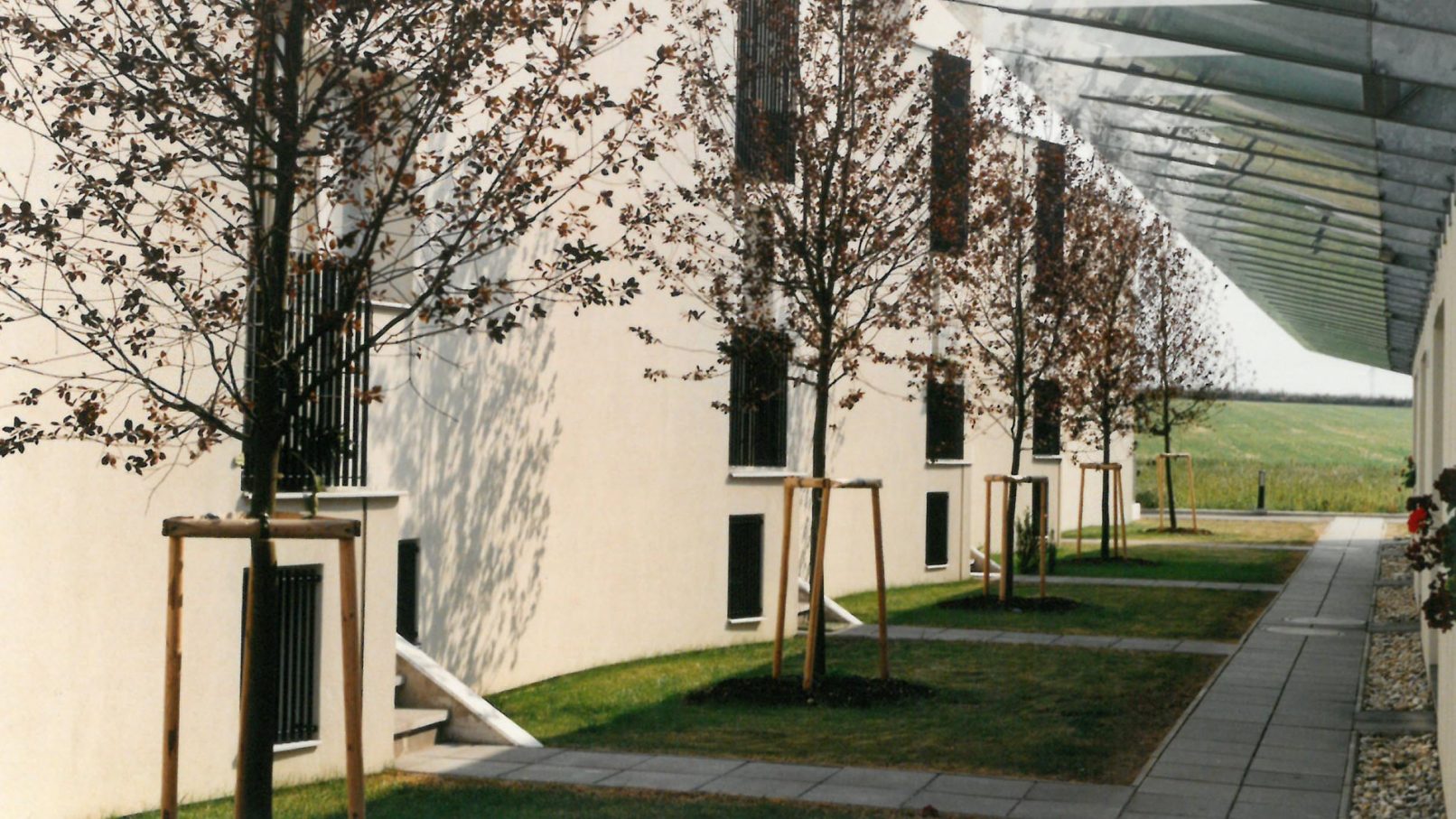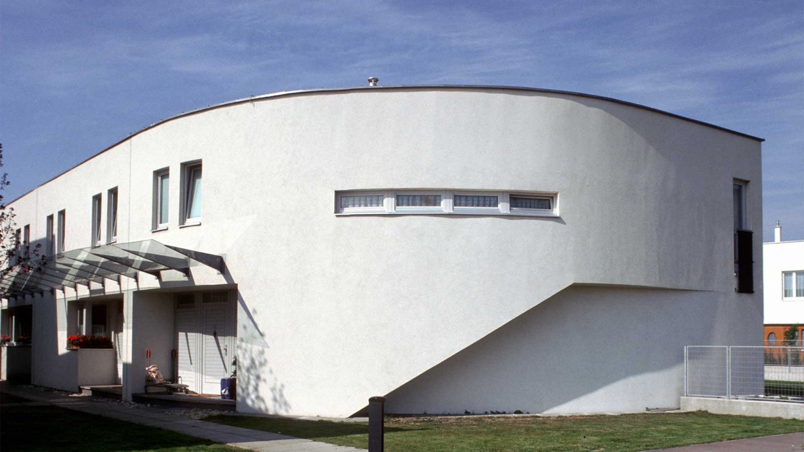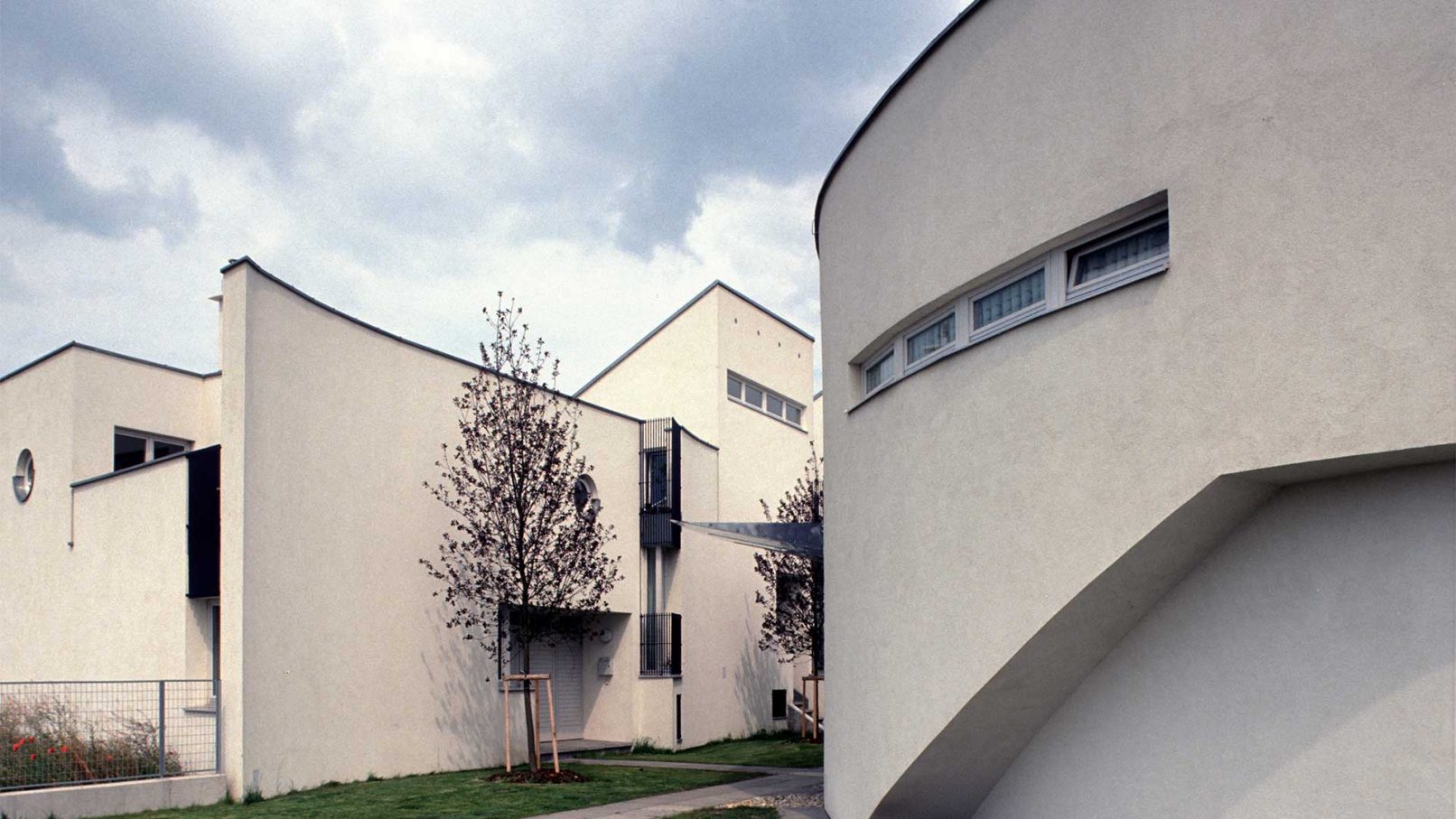 UNTER EINEM VORGEGEBENEN LEITPROJEKT ENTWERFEN 4 ARCHITEKTEN VERSCHIEDENE REIHENHAUSTYPEN. TROTZ DES KOSTENRAHMENS KÖNNEN SOWOHL BEI DEN MATERIALIEN (ZIEGEL, HOLZ), ALS AUCH BEI DEN RAUMVORSTELLUNGEN (ZWEI GESCHOSSIGE WOHNRÄUME, GLASHÄUSER, GALERIEN, GESCHWUNGENDE TREPPEN, DACHTERRASSEN), DIE IDEEN REALISIERT WERDEN. DIE KLARE, ZEITGEMÄßE ARCHITEKTUR WIRD DURCH DIE VIELFALT DER HAUSTYPEN ZU EINER INTERESSANTEN SIEDLUNGSFORM.